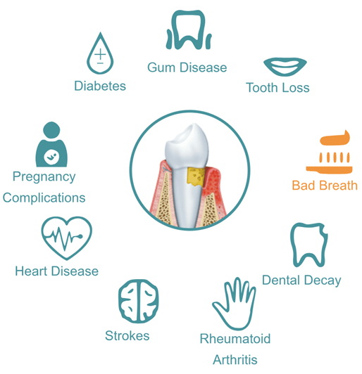For example, periodontal disease has been associated with serious, systemic health conditions, including diabetes and heart disease. We call this connection the oral-systemic health link. Or to put it another way, what happens in one area of the body has a tendency to affect other areas as well.